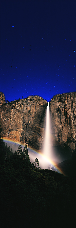 Given that the moon does travel fairly quickly across the sky, a time exposure can’t be much longer than a few minutes, otherwise the moonbow will move across the bottom of the falls too quickly and blur out the colors. Even though the moon is full, you can still see some stars above the waterfall. In fact, the North Star is actually in the photograph, to the left of the top of the waterfall. You can see that the other stars in the area are circling around it.